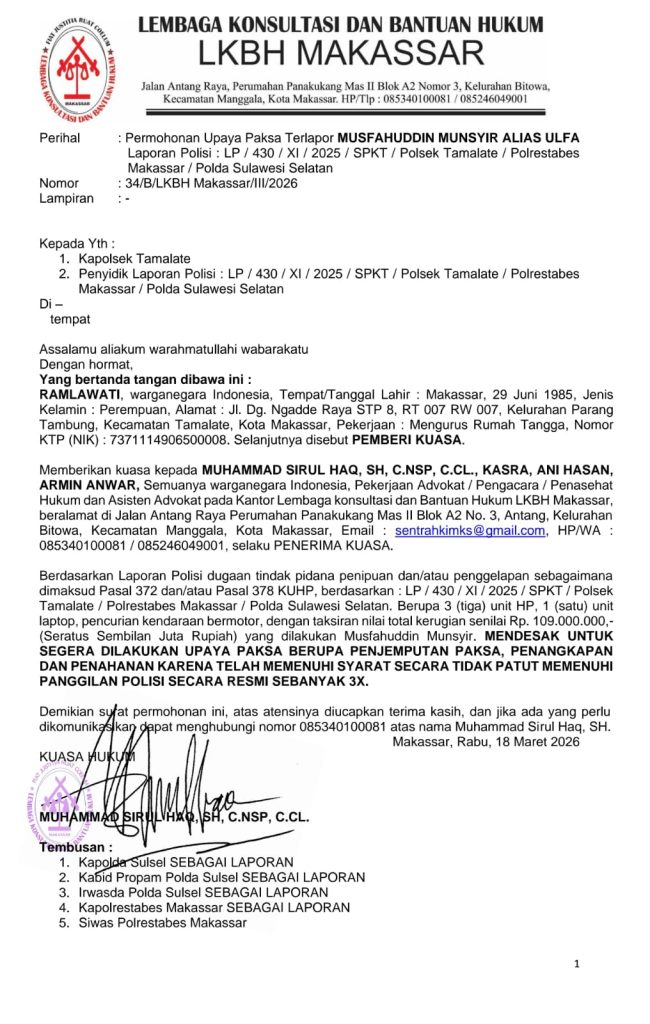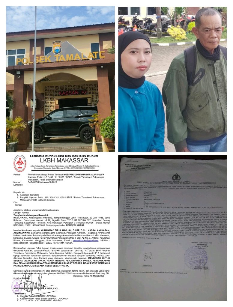 Makassar, 18 Maret 2026 — Lembaga Konsultasi dan Bantuan Hukum (LKBH) Makassar mendesak Kepolisian Sektor Tamalate untuk segera melakukan penangkapan terhadap terlapor Musfahuddin Munsyir alias Ulfa dalam kasus dugaan penipuan dan/atau penggelapan yang merugikan korban hingga ratusan juta rupiah.