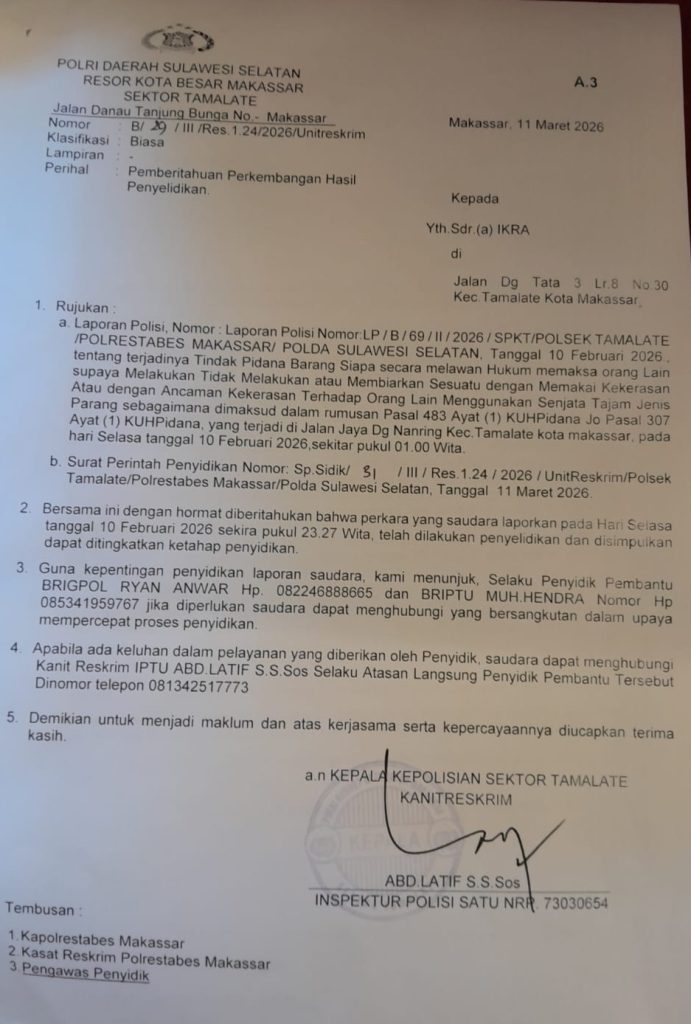 Andi Agung Salim S.H, CLA, yang biasa di panggil (Andhis) Selaku kuasa pendamping korban, saat wawancara langsung di depan pelataran parkir Polsek Tamalate oleh beberapa awak media Menyatakan, kami menilai adanya ketidakseriusan Polsek Tamalate dalam penanganan perkara tersebut. Bahkan, muncul dugaan adanya keberpihakan oknum aparat terhadap terlapor. Kamis, 6 Maret 2026.